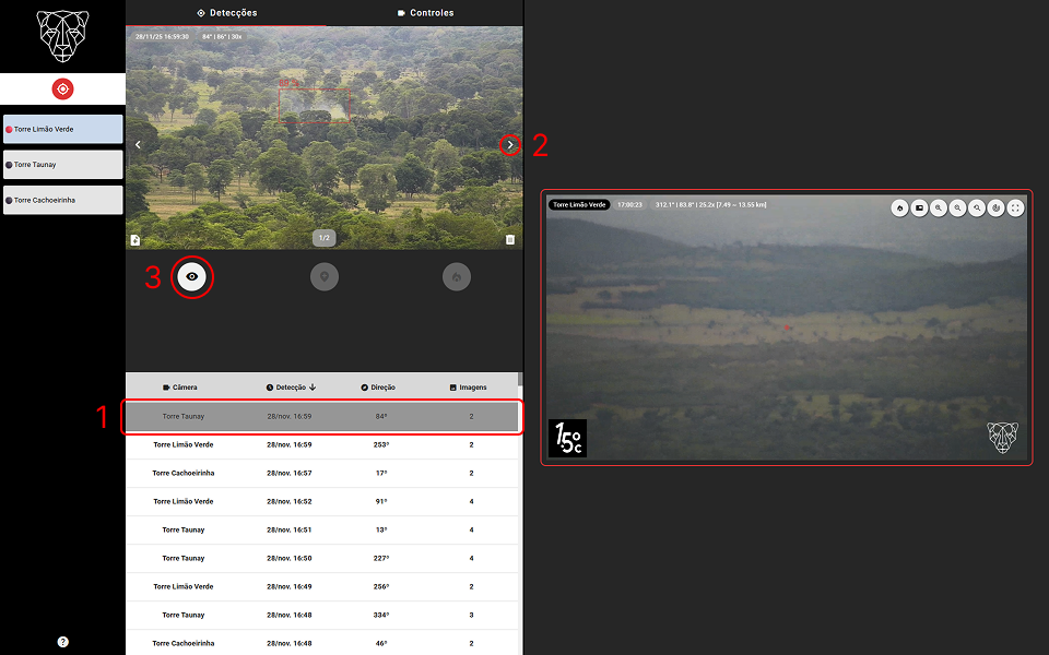 Escolha a detecção (1) a ser localizada, selecione a imagem com maior nível de zoom (2) e clique em “Visualizar ocorrência” (3) para posicionar a câmera na direção do foco de incêndio