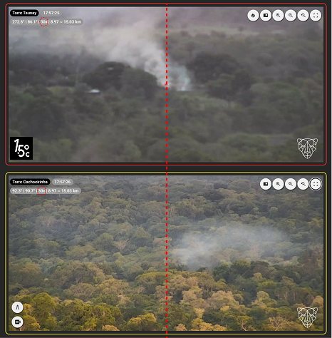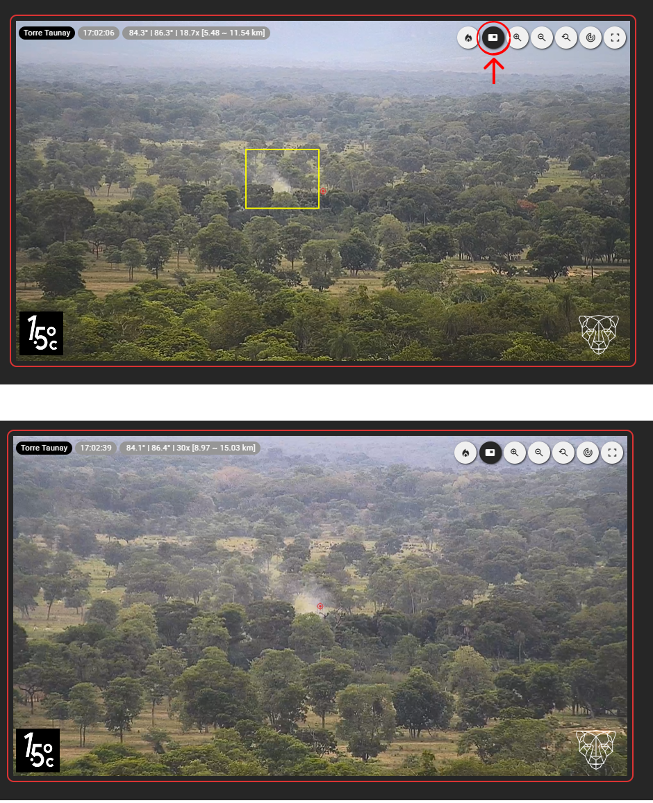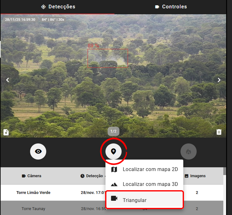 Após identificar o foco com a câmera de triangulação, aplique o zoom máximo disponível. Certifique-se que ambas as câmeras apontam para o mesmo incêndio e estão centralizadas na base da fumaça. Por fim, confirme a triangulação no botão com ícone de compasso e gere o relatório da ocorrência clicando no botão com ícone de fogo.
